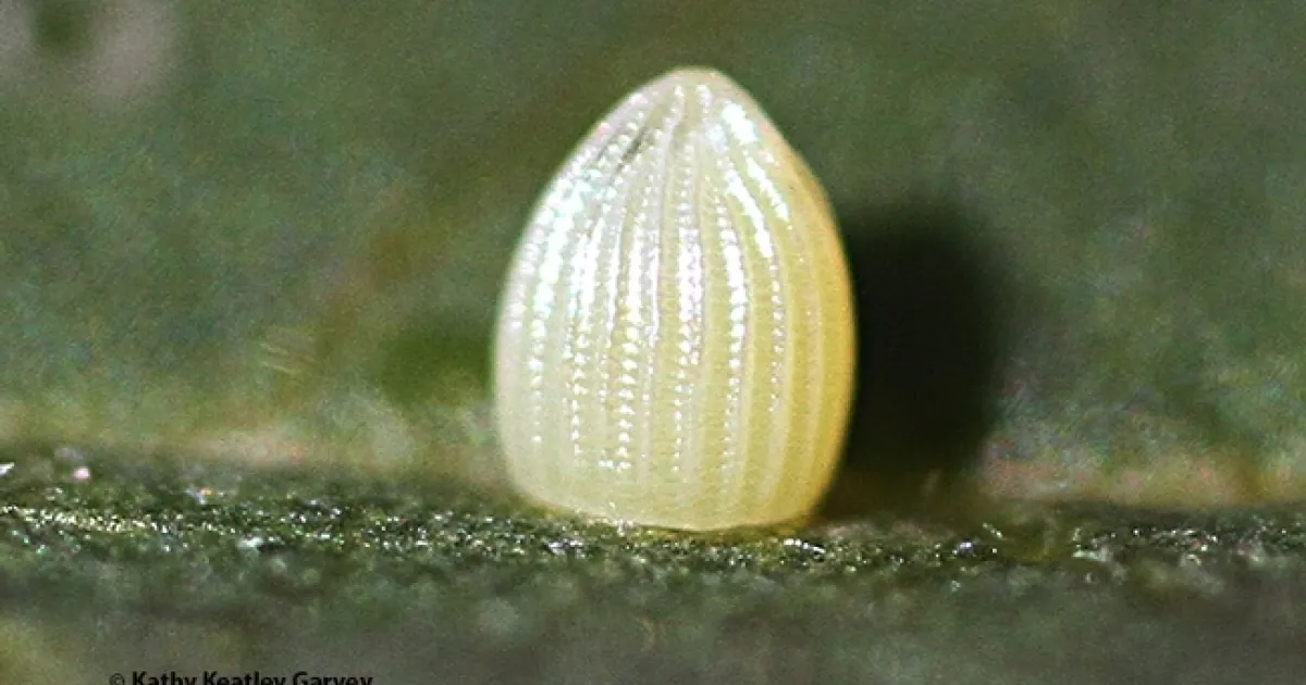 The egg, I commented, is “an incredible work of nature! The intricate egg is about the size of a pinhead, 0.9mm wide and 1.2mm high. It's creamy yellow with narrow longitudinal ridge. Unless it encounters a predator or parasitoid or another life-threatening factor, the egg will usually hatch 3 to 4 days after Mama Monarch deposits it beneath a milkweed leaf.”