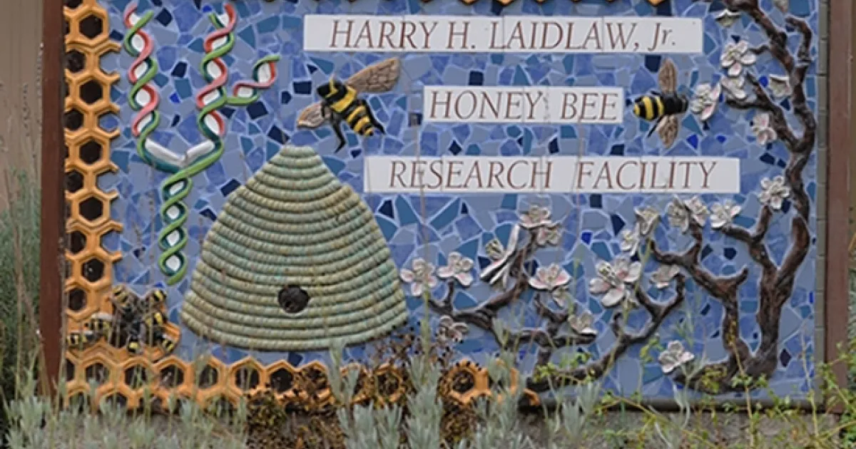 If you visit the UC Davis bee biology facility, the Harry H. Laidlaw Jr. Honey Bee Research Facility located on Bee Biology Road, west of the central campus, you'll see a sign memorializing him. The sign, the work of Davis-based artist Donna Billick, creatively includes a hole in the skep for bees to tunnel to a hive located in back.   For years we saw bees entering with pollen, leaving to get more, and guard bees on duty. Due to liability issues, the hive is no longer there, but there are plenty of hives in the apiary behind the building.