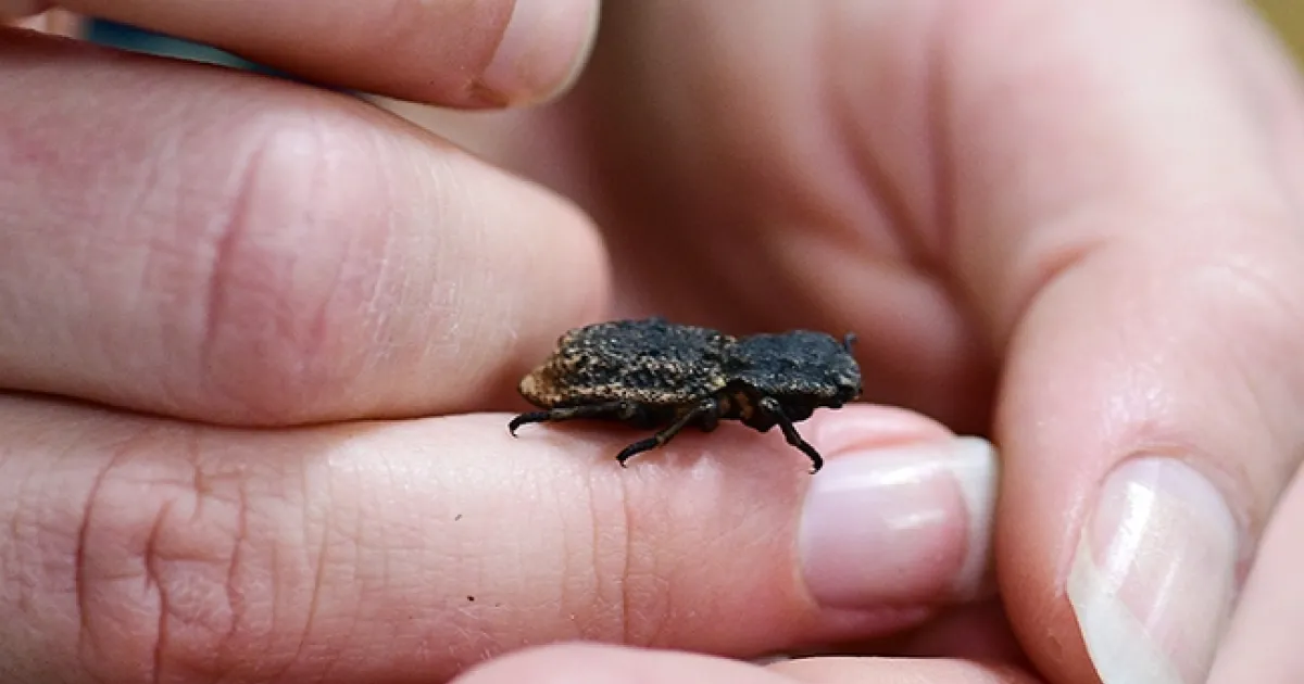 It lies flat and low to the ground and is built like a little armored tank. It can withstand crushing forces--not just your foot, a pinch, or a battering ram, but a 3400-pound car. UC Riverside researcher Jesus Rivera, now of UC Irvine, performed compression tests in 2015: a Toyota Camry drove over the beetle twice and it survived.