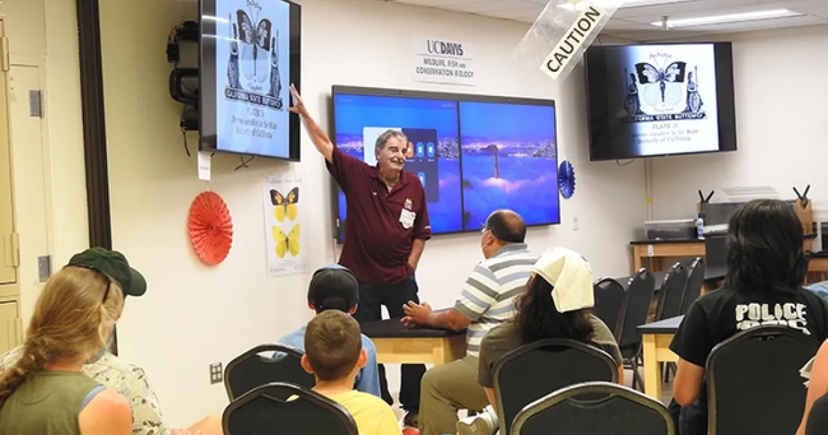 Bohart associate Greg Kareofelas talks about the history of the California dogface butterfly. (Photo by Kathy Keatley Garvey)