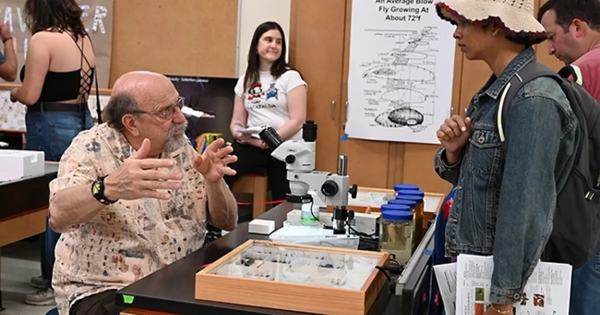 Kimsey staffs the annual “Dr. Death” booth at Briggs Hall during the campuswide UC Davis Picnic Day. He pin-mounts and identifies flies from various cases and research efforts, and displays studies on the sequence of development of individual maggots, calling attention to the development and sequence of communities of insect maggots. "By these means, approximations about how long a person has been dead can be made," he told the crowd. He also discussed recently adjudicated cases.