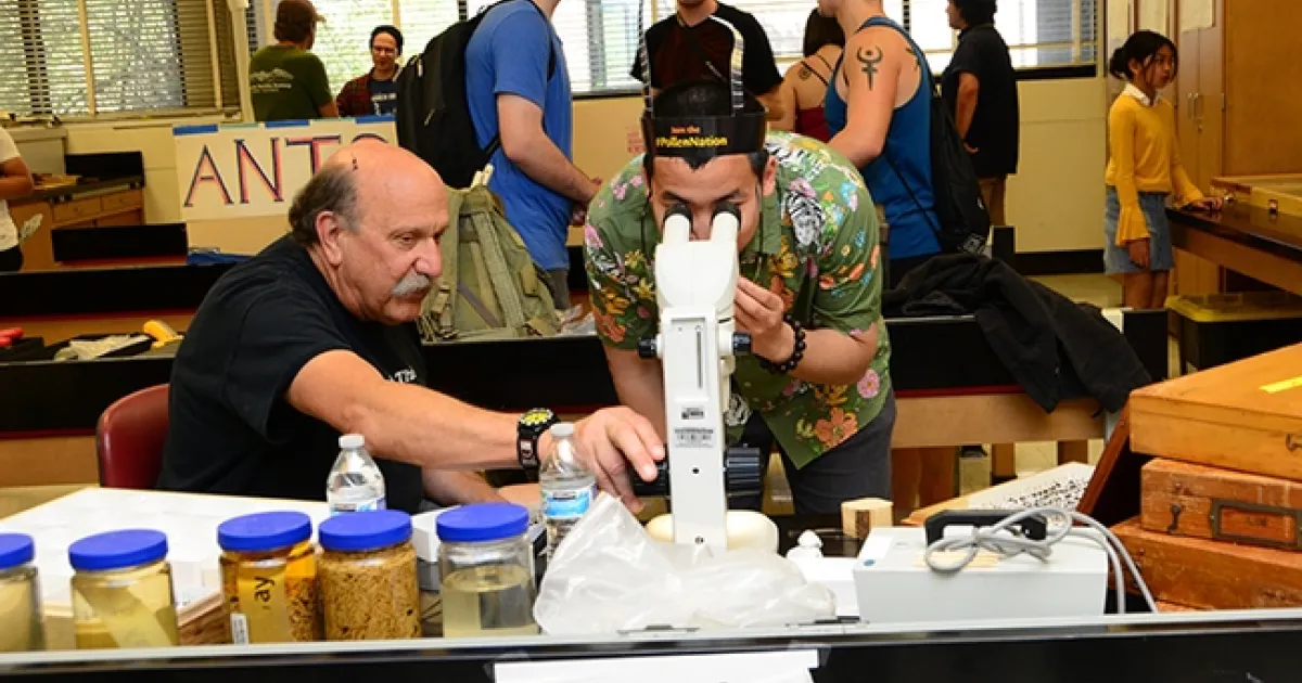 Forensic entomologist Robert Kimsey (left) held forth at the forensic entomology table in Briggs Hall during the 2019 UC Davis Picnic Day. He recently won a College of Agricultural and Environmental Sciences' advising award. (Photo by Kathy Keatley Garvey)