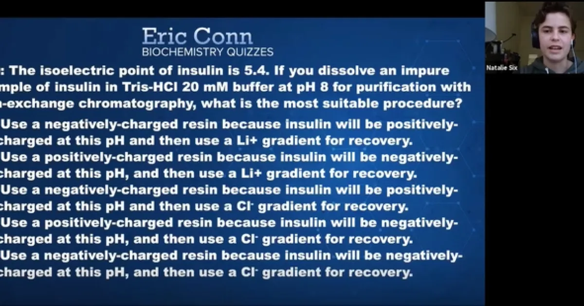 The other online teams sported such names as the Green Team (named for the late Mel Green, UC Davis genetics pioneer), Amigo Acids, Proline Pros, Drop the Base, Krebs Cyclists, and Attack on Titration. Of the four off-tube teams (Teams A, B, C and D), Team A and Team B won. Team A members: Efrain Vasquez Santos, Daniel Colón, Eva Pak, Stephanie Matsumoto and Julia Ekmekchyan. Team B members: Brycen Carter, Beatrice Ark-Majiyagbe, Ritika Pudota, Katie Kim and Samantha Levy) won.