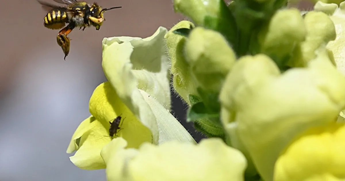 Last weekend we spotted female European wool carder bees (so named because they collect or card plant hairs for their nests) buzzing in and out of our snapdragons.
