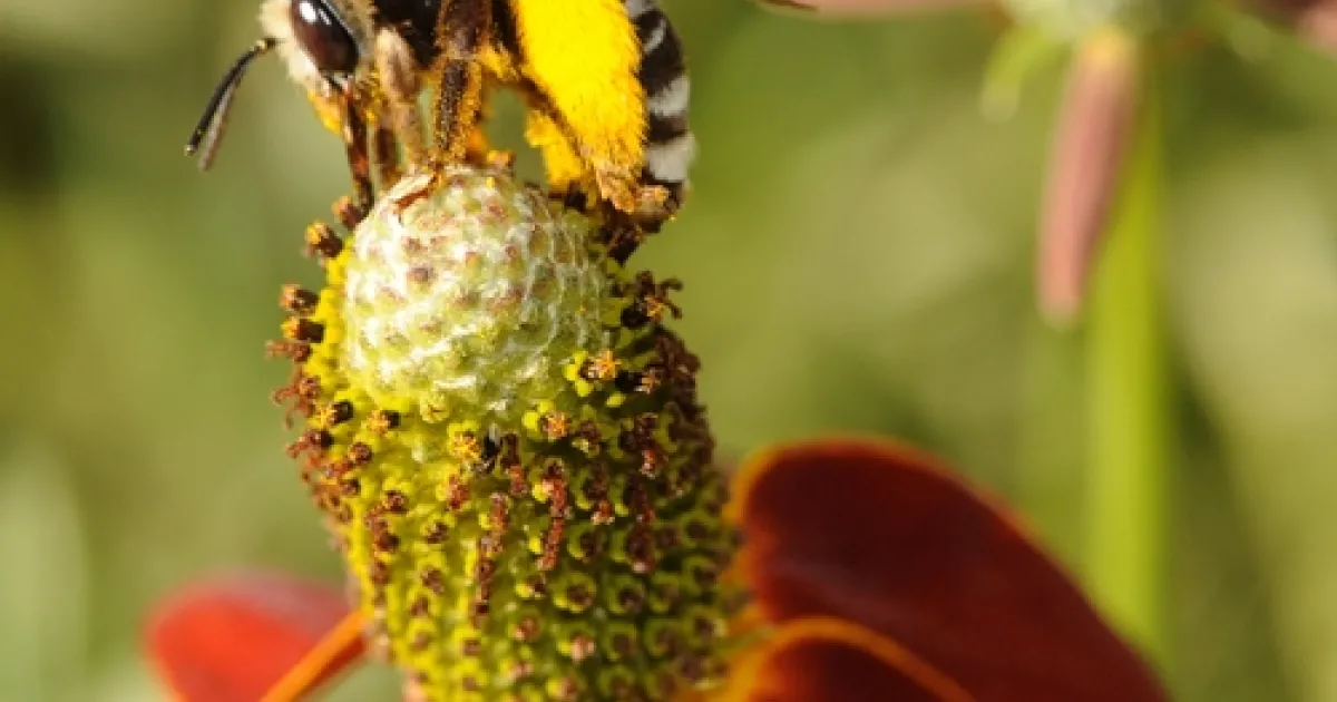 But when a native wild bee such as the Svastra obliqua expurgata, also called "the sunflower bee," forages on a Mexican hat flower, it adds a little gaiety to the scene.