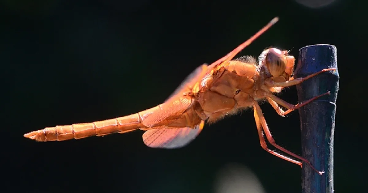 A male flameskimmer dragonfly, Libellula saturata, perches on a bamboo stake. (Photo by Kathy Keatley Garvey)