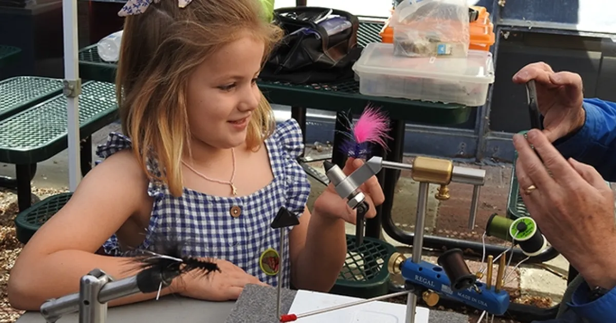 To the delight of wide-eyed youngsters, the anglers demonstrate the intricate art of fly tying, and then gift the finished product to them.