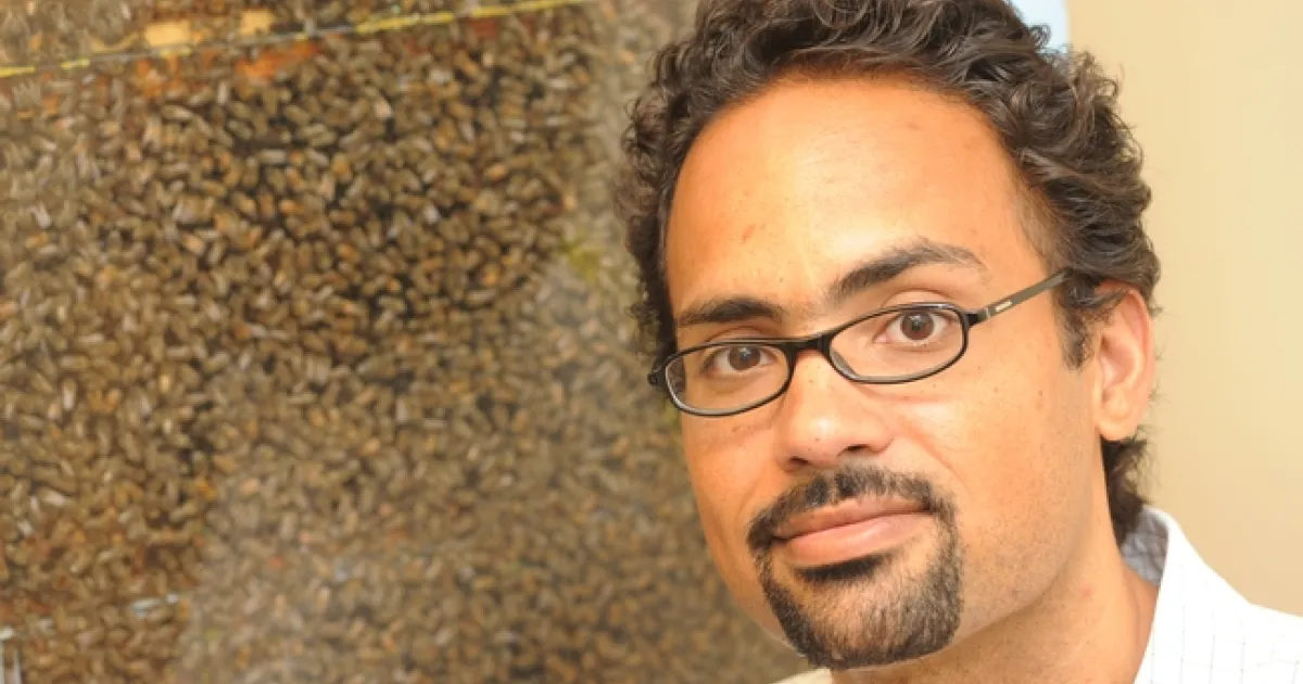 Bee scientist Brian Johnson of the UC Davis Department of Entomology in front of an observation hive. (Photo by Kathy Keatley Garvey)
