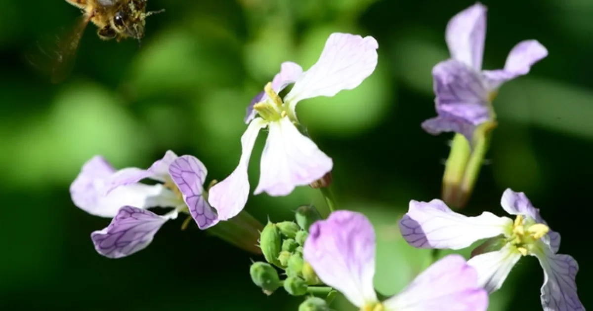 A honey bee heading for wild radish. (Photo by Kathy Keatley Garvey)