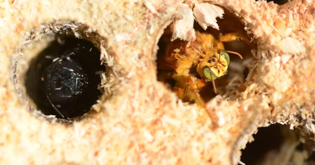 When a rotten apple tree was cut down last week on private property in Davis, scores of eyes peered from the drilled holes. Soon, adult male Valley carpenter bees (Xylocopa varipuncta)--those green-eyed golden bees known as "teddy bears"--emerged with their female counterparts. The males and females look nothing alike; the females are solid black.