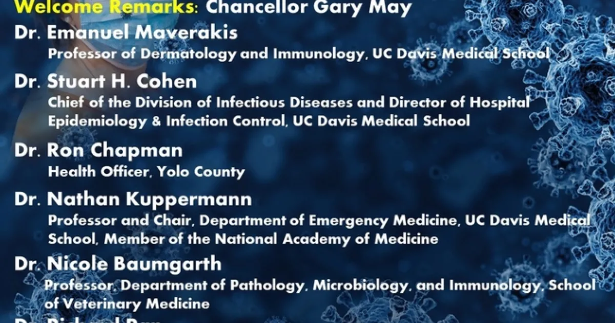 Chancellor Gary May will deliver the welcoming address. Main speakers are UC Davis physician-scientists Emanuel Maverakis, Stuart Cohen and Nathan Kuppermann; UC Davis veterinarian-scientist Nicole Baumgarth; physician Ron Chapman, Yolo County Health Officer; and pediatrician State Sen. Richard Pan, District 6 chair, Senate Committee on Health.