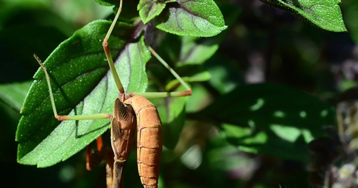 Praying mantis expert Lohitashwa "Lohit" Garikipati, identified this species as a subadult male, Stagmomantis limbata, perched in a patch of African blue basil in our family's pollinator garden. When the temperature soared to 105 degrees, Mr. Mantis escaped the heat by slipping beneath the leaf. Mantids are not only great ambush predators but they know how to keep cool!