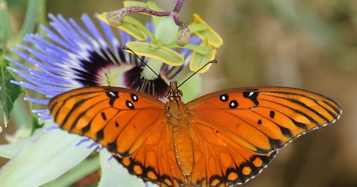 The Gulf Frit is a beautiful butterfly with bright orange-red wings, spangled iridescent silver on the underside, and a four-inch wingspan.