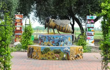 There is much to see at the haven. A six-foot-long worker bee sculpture anchors the garden. It is the work of self-described "rock artist" Donna Billick, who specializes in mosaic ceramic art. Billick and UC Davis entomology professor Diane Ullman co-founded and co-directed the UC Davis Art/Science Fusion Program, which spearheaded the student/community art in the garden. See history of the garden.