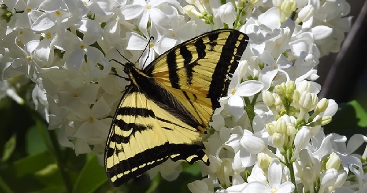Side view of the Western tiger swallowtail on the lilac bush. (Photo by Kathy Keatley Garvey)