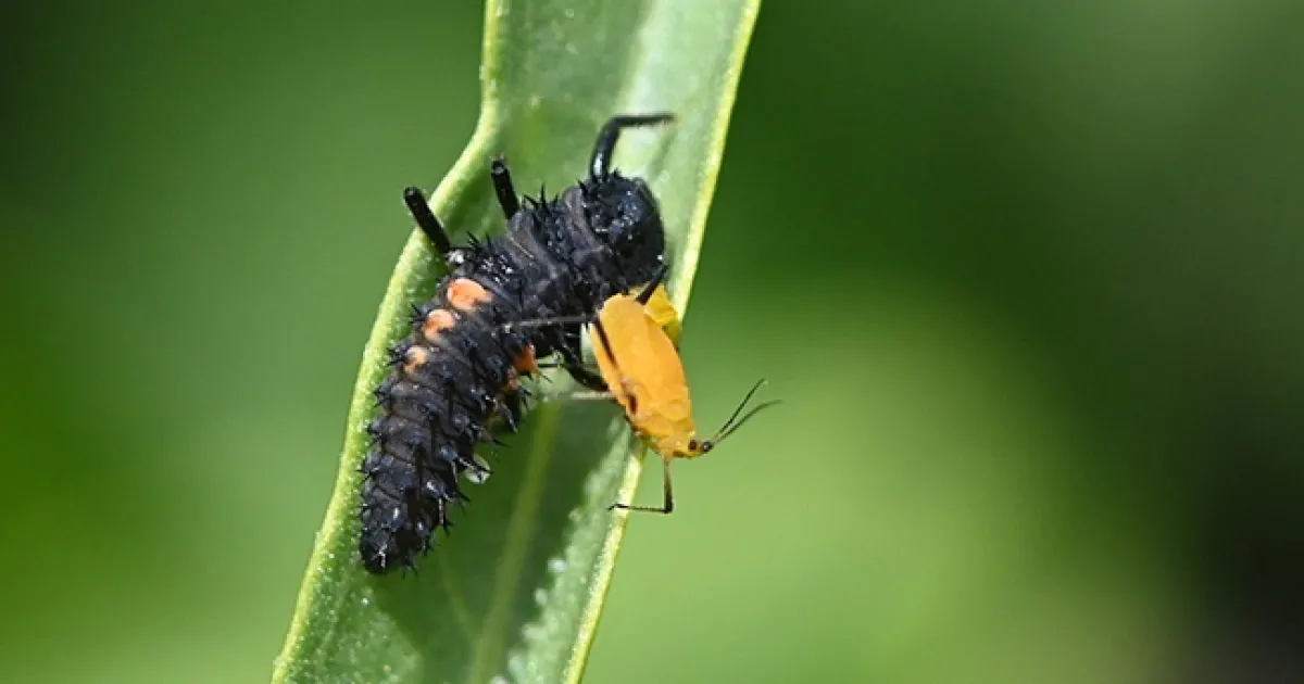 Have you ever seen the larva of a lady beetle (aka ladybug) dining on an aphid?
