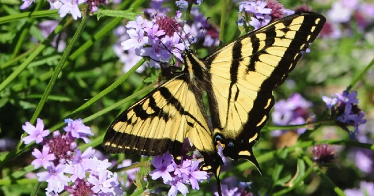 A Western Tiger Swallowtail (Papilio rutulus) spreads its wings on a Verbena patch. (Photo by Kathy Keatley Garvey)