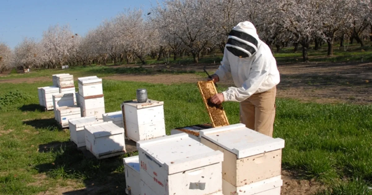 Bee breeder-geneticist Michael "Kim" Fondrk works the Page bees in a Dixon almond orchard. (Photo by Kathy Keatley Garvey)