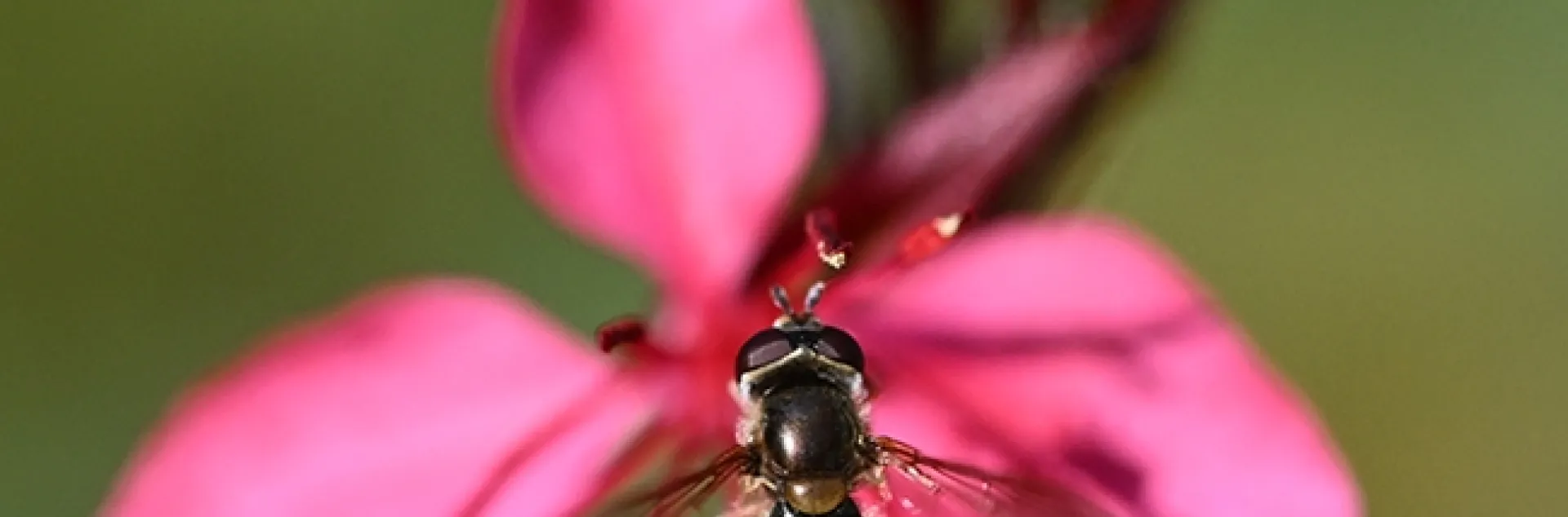 This syrphid, caught in flight, was seeking nectar from a Gaura, a genus of flowering plants in the family Onagraceae, native to North America.