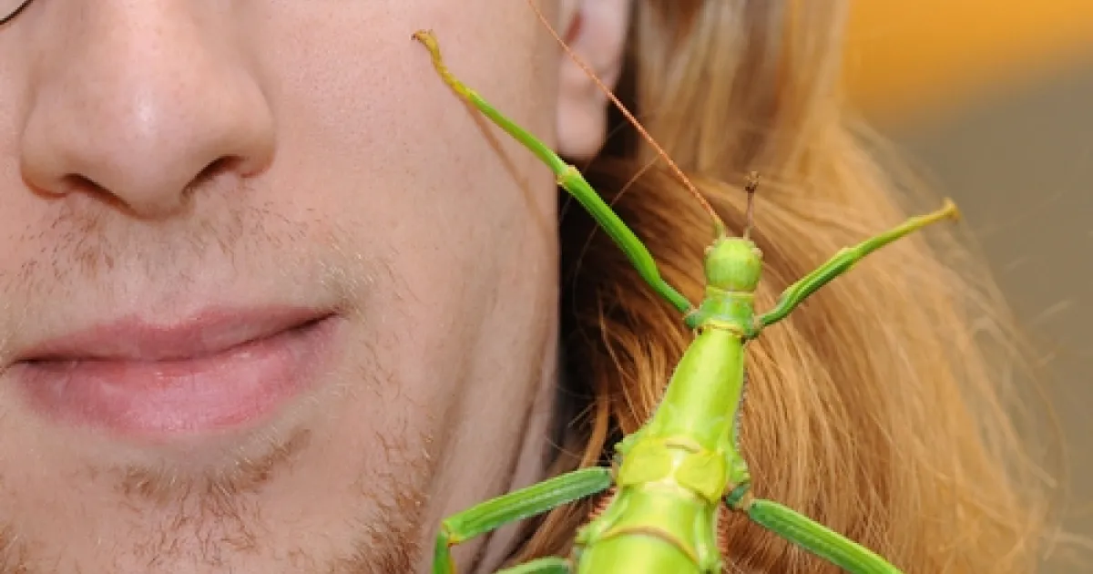 MY BUDDY--Matan Shelomi, a first-year graduate student in entomology at UC Davis, checks out a lime green walking stick at the Bohart Museum of Entomology. It will be a key attraction at the insect museum on Picnic Day, set April 17. (Photo by Kathy Keatley Garvey)
