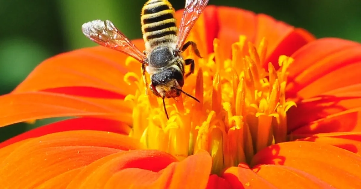 Female leafcutting bee, Megachile fidelis, foraging on a Mexican sunflower. (Photo by Kathy Keatley Garvey)