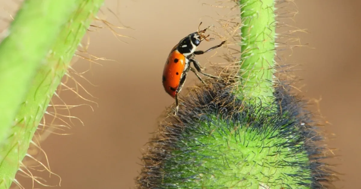A lady beetle, newly rescued from the bathroom of a restaurant in Marin County, crawls on an Iceland poppy in a Solano County bee garden. Freedom! (Photo by Kathy Keatley Garvey)