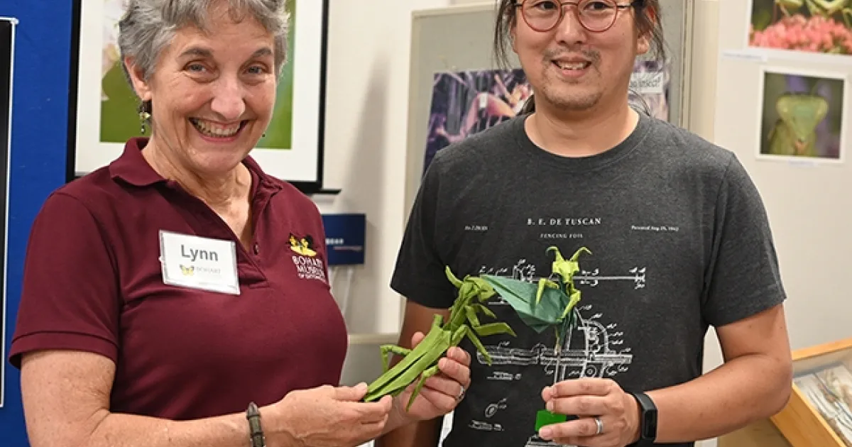 For the Bohart Museum open house on praying mantises, Kevin Murakoshi of Davis crafted these intricate origami praying mantises. With him is UC Davis distinguished professor Lynn Kimsey, director of the Bohart Museum. Murakoshi, a UC Davis alumnus and former UC Davis employee (computer research specialist), is the principal solutions architect at Amazon Web Services. (Photo by Kathy Keatley Garvey)