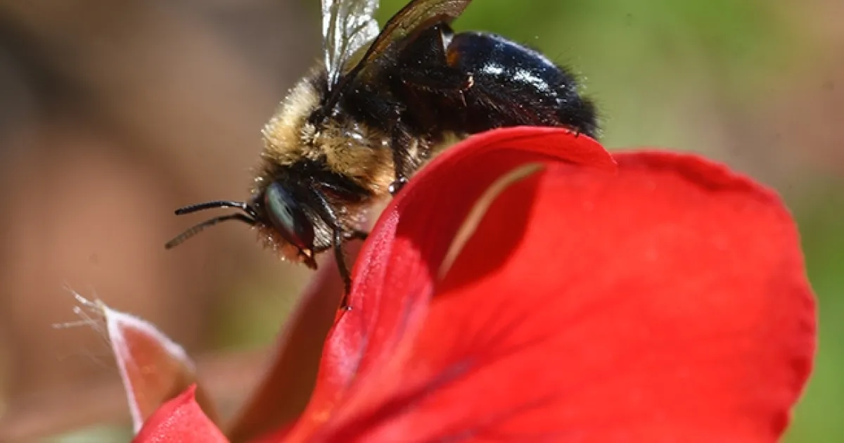 - The Valley carpenter bee, Xylocopa varipuncta, the largest of the California carpenter bees. It's about an inch long. The female is solid black, while the male, commonly known as "the teddy bear bee," is a green-eyed blond. Why teddy bear? It's fuzzy and does not sting--or as the late Robbin Thorp (1933-2019) distinguished emeritus professor of entomology at UC Davis, was fond of saying: "Boy bees don't sting."