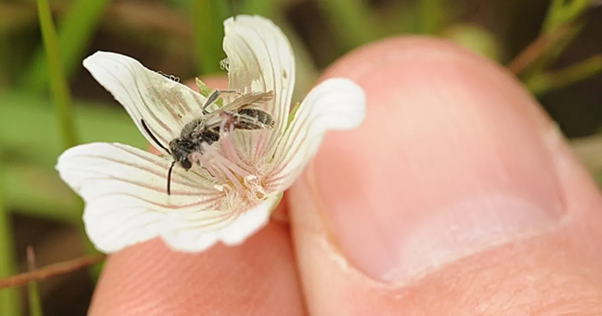 We were out there Monday morning and saw a mining bee nestled inside a white flower cup. The bee, about the size of a grain of rice, wasn't moving.