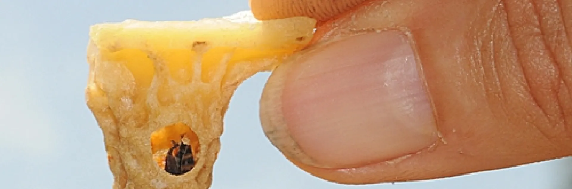The first virgin queen bee to emerge from her cell (each queen cell resembles a peanut shell) will rid the colony of her competition.