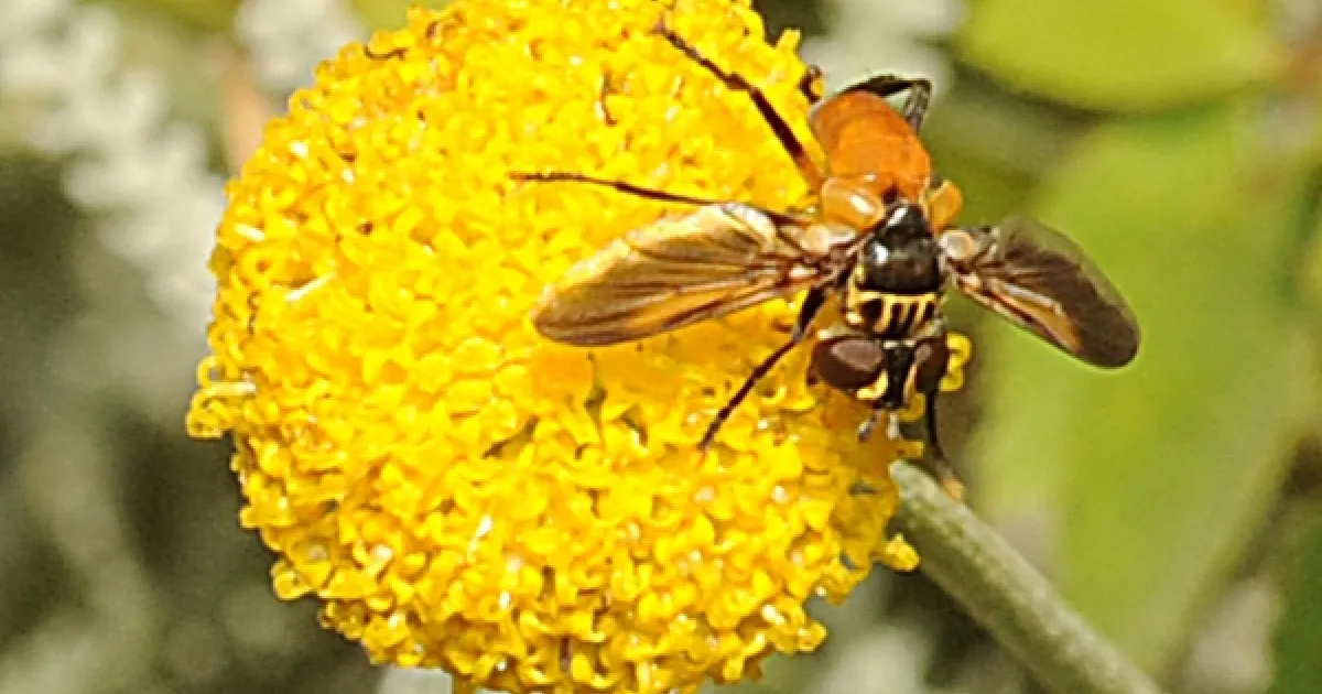 We took a photo of "what's THAT?" yesterday on a Yolo County farm. Native pollinator specialist Robbin Thorp, emeritus professor of entomology at UC Davis, identified it as family Tachinidae, genus Tichopoda and species, probably T. pennipes.