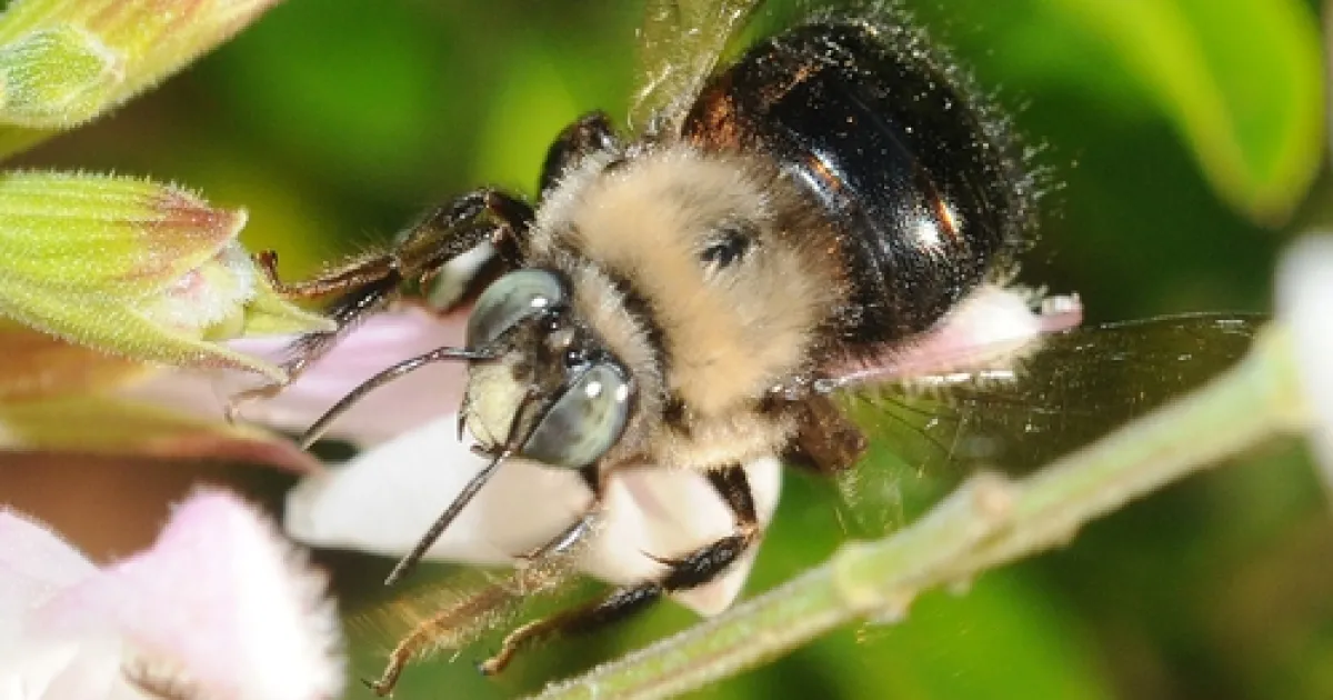 OL' GREEN EYES--This is a male valley carpenter bee (Xylocopa varipuncta), often referred to as a "teddy bear." Males do not sting.(Photo by Kathy Keatley Garvey)