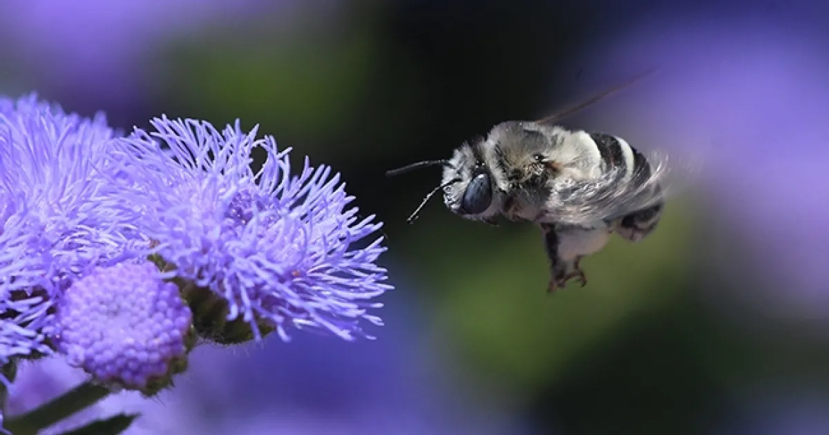We were visiting the Sunset Gardens at the Sonoma (Calif.) Cornerstone on Sunday--marveling at the brilliant blue floss flowers, Ageratum houstonianum 'Blue Horizon'--when a bee with the familiar black and white abdominal stripes streaked by.