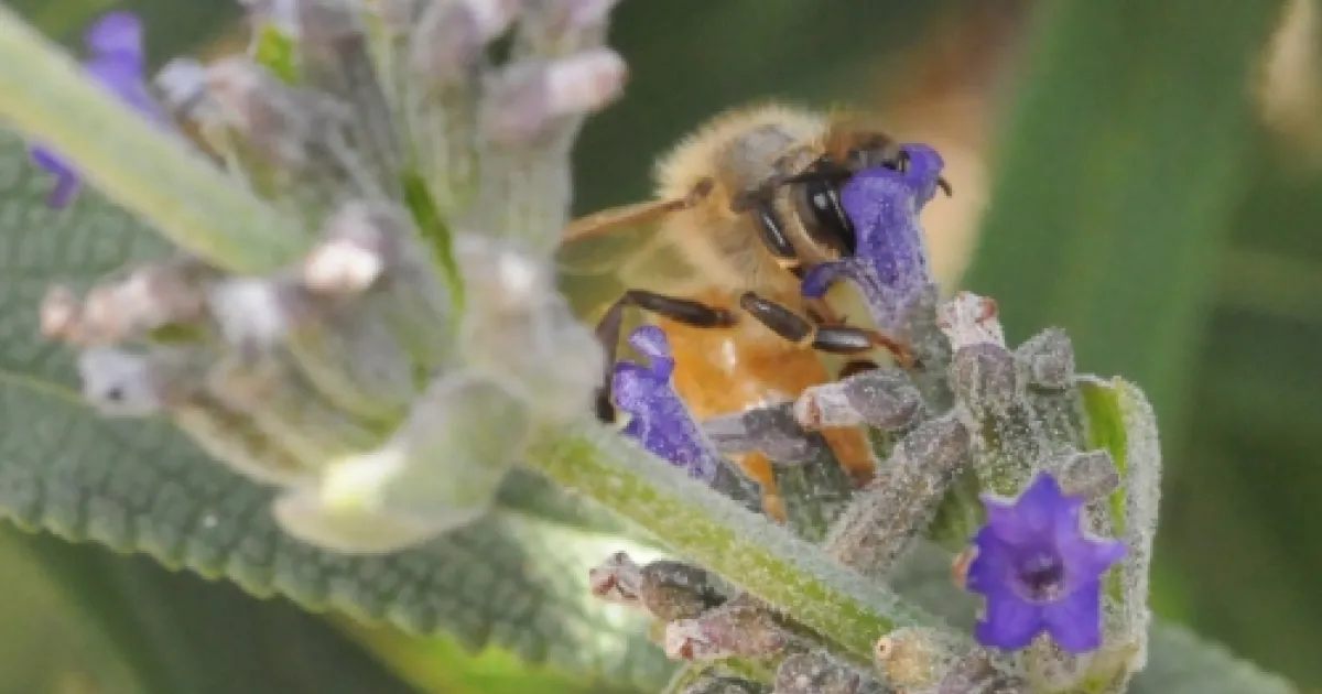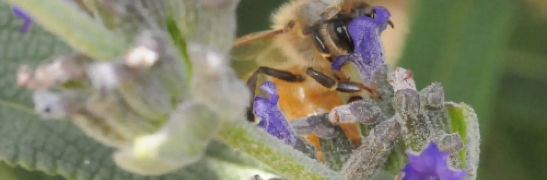 A honey bee visiting a Russian sage seems to be wearing a new hat. (Photo by Kathy Keatley Garvey)