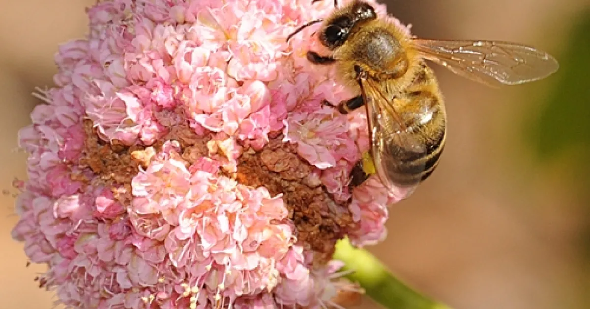 Attractive to honey bees, native bees and butterflies, red buckwheat is flourishing in the garden. Okay, it's called red buckwheat, but the clusters are rosy pink. They're about the same size as ping-pong balls.
