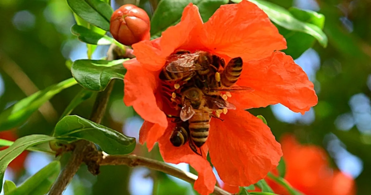 Honey bees foraging last week on a pomegranate tree on Hopkins Road, west of the UC Davis main campus, competed for food on hundreds of blossoms.