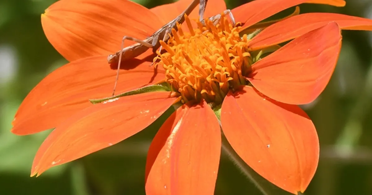 It's Aug. 2, 2020 and a praying mantis decides to occupy a specially stunning Mexican sunflower. Specifically, it's a female Stagmomantis limbata occupying a Tithonia rotundifolia.
