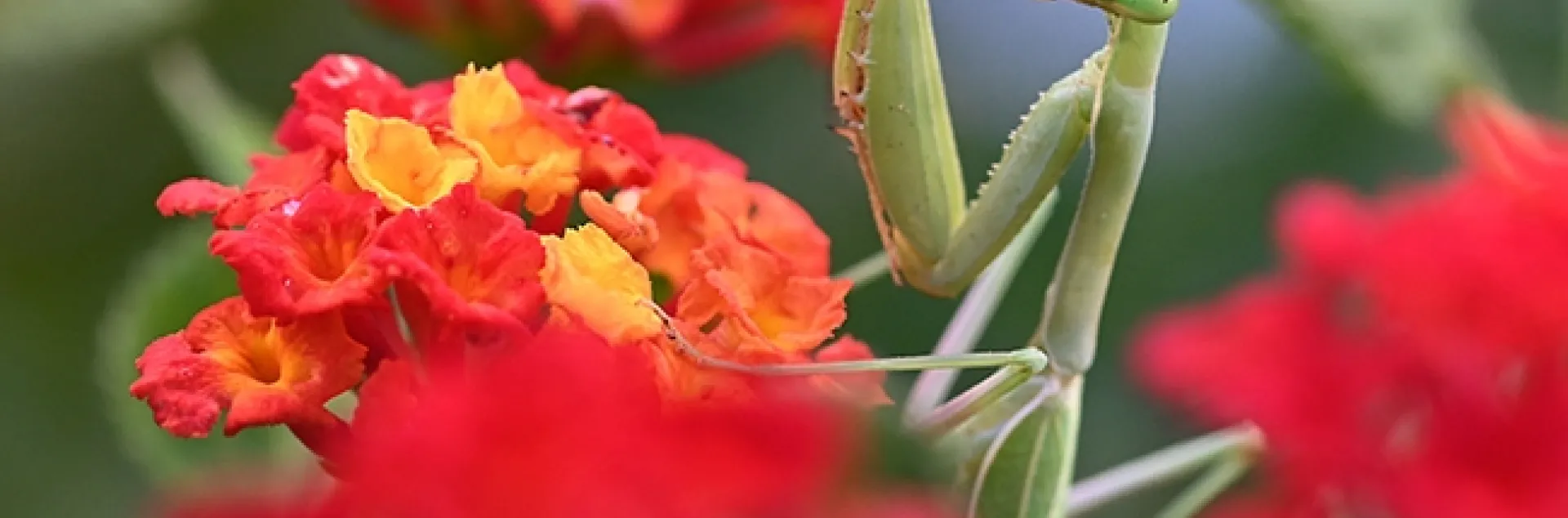 This female praying mantis, a Stagmomantis limbata, selects a patch of red Lantana to watch for pollinators.