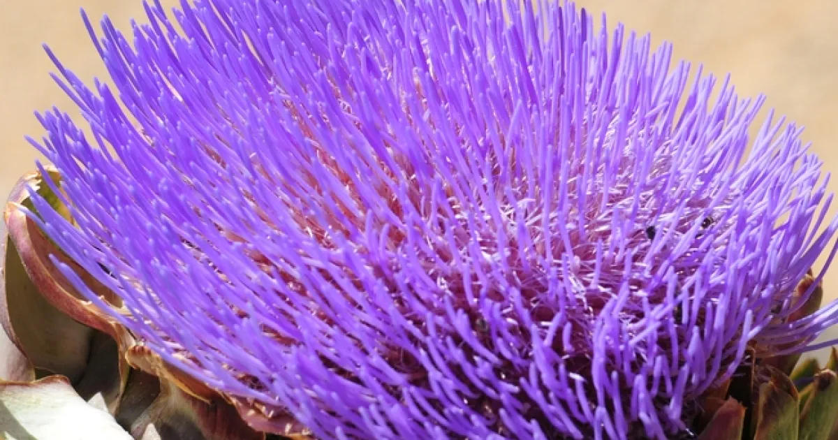 Honey bee heads toward a flowering artichoke. (Photo by Kathy Keatley Garvey)