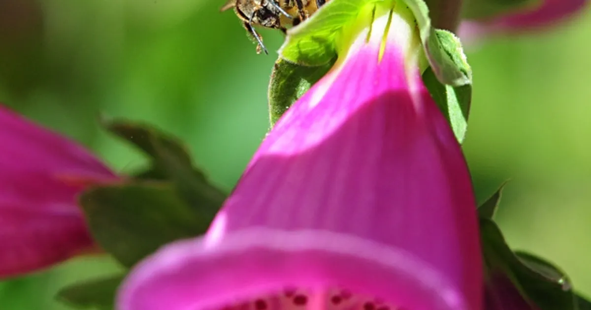 A honey bee looking for a hole drilled by a carpenter bee in the corolla of a foxglove. (Photo by Kathy Keatley Garvey)