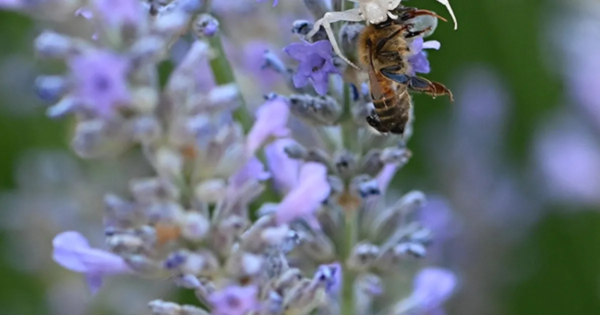 Our resident crab spider, family Thomisidae, appears to be an extremely poor hunter. She waits, camouflaged in the lavender patch, as bees buzz around her. They dart away when she lunges at them.