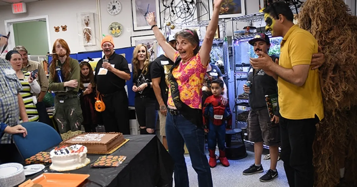 Forensic entomologist Robert Kimsey wore his ghillie suit. Bohart associate Emma Cluff came dressed as "The Mad Hatter." Tabatha Yang, education and outreach coordinator, disguised herself as a monarch caterpillar.