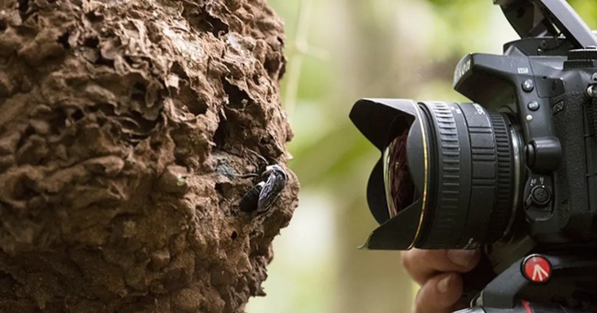 It was the last day of their five-day trip when they found it: a single female Wallace's Giant Bee living in an active termite mound in a tree about 2.5 meters off the ground. The bee, which nests in active arboreal termite mounds, lines her nest with tree resin to protect it from termites.