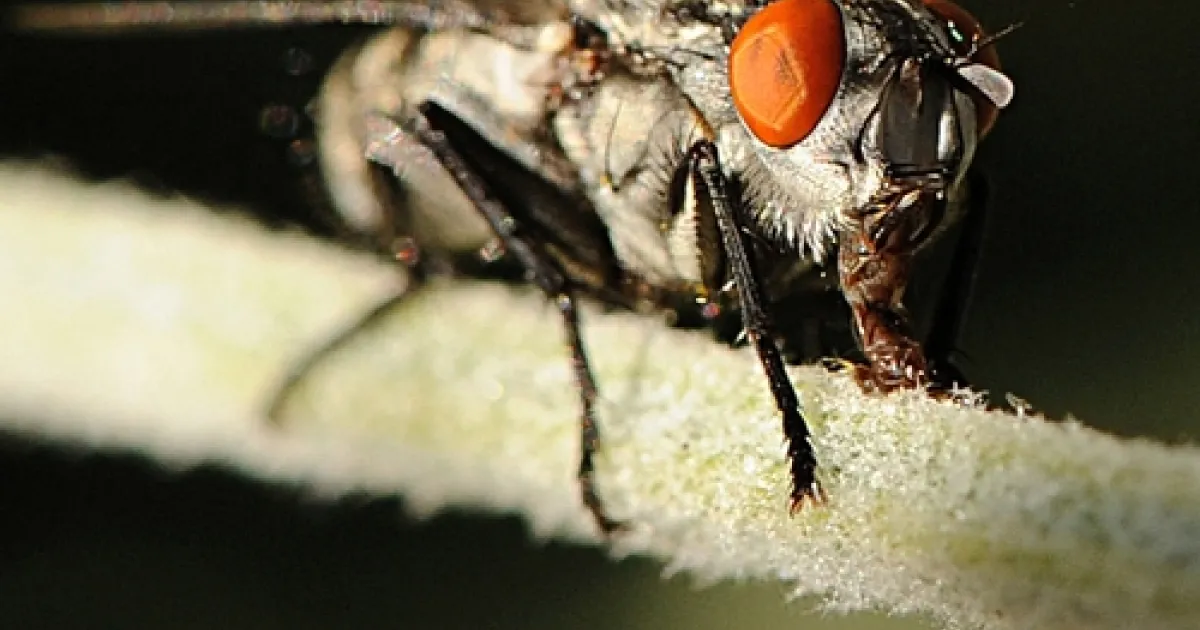 The red-eyed fly, which in its larval stage is associated with decaying flesh, sipped a little nectar and then paused momentarily to groom itself.