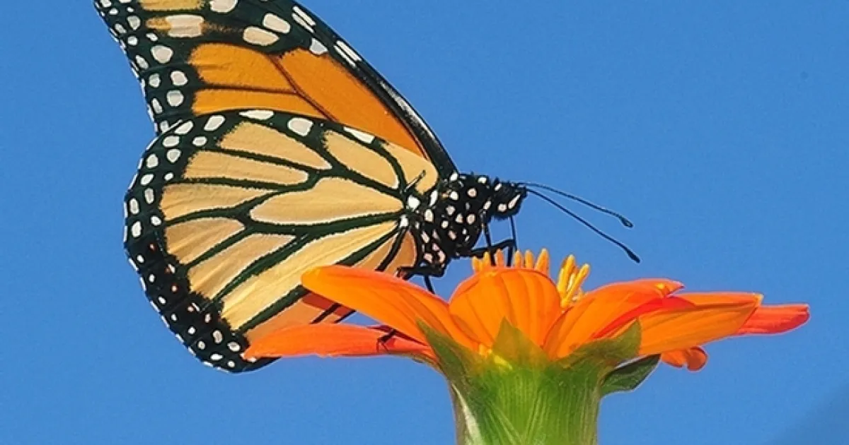 A monarch butterfly, Danaus plexippus, nectaring on a Mexican sunflower, Tithonia rotundifola, in Vacaville, Calif. (Photo by Kathy Keatley Garvey)