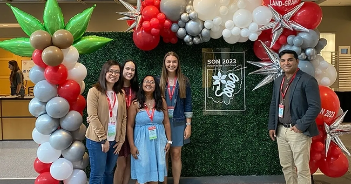 The UC Davis Shahid Siddique lab excelled at the international Society of Nematologists' 62nd annual meeting, held in Columbus, Ohio. Pictured with Siddique are doctoral students in his lab. From left are Ching-Jung Lin, Veronica Casey, Pallavi Shakya and Alison Coomer Blundell, all award winners.