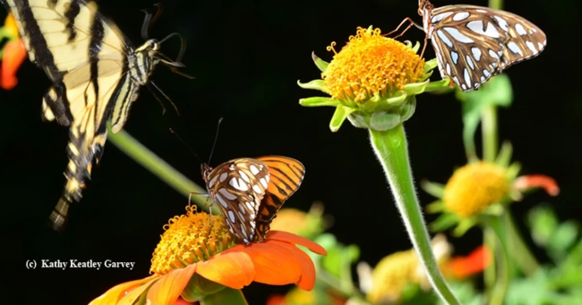 Last July we were admiring two newly emerged Gulf Fritillary butterflies on Mexican sunflowers (Tithonia) when a Western Tiger Swallowtail fluttered down, seemingly out of nowhere, to occupy the same sunflower as one Gulf Frit.