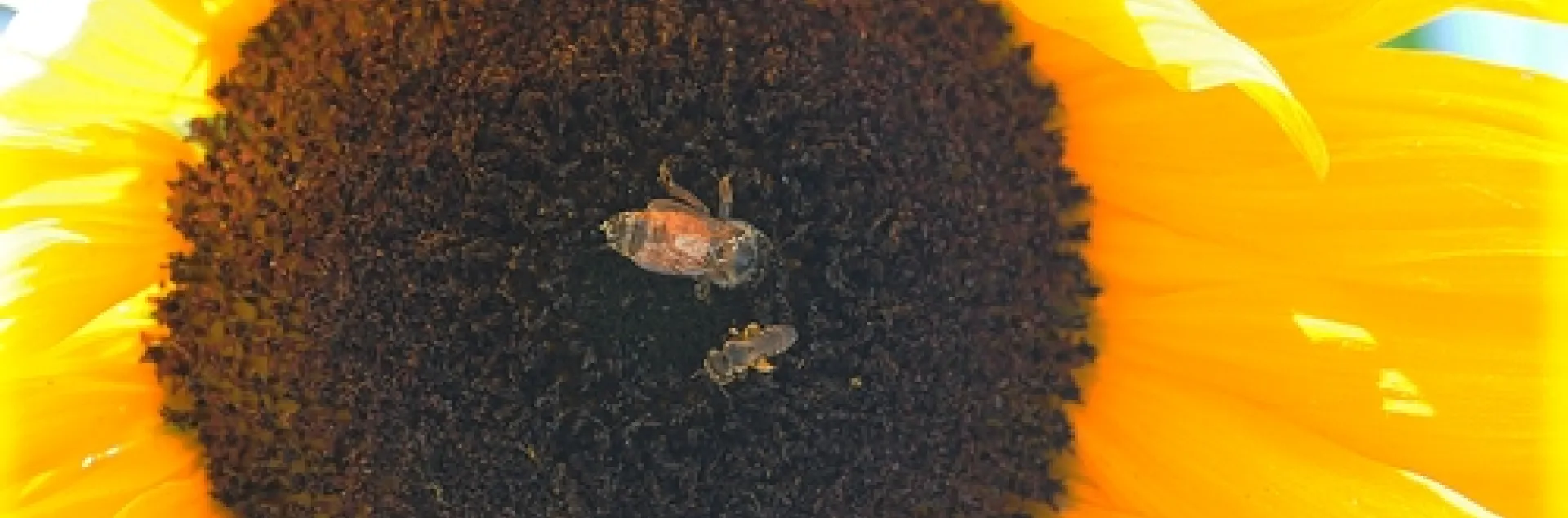 We took this photo in Healdsburg last week of a non-native bee (the common European or Western honey bee, Apis mellifera) and a native sweat bee (Halictus ligatus) sharing a plant native to the Americas: the sunflower.