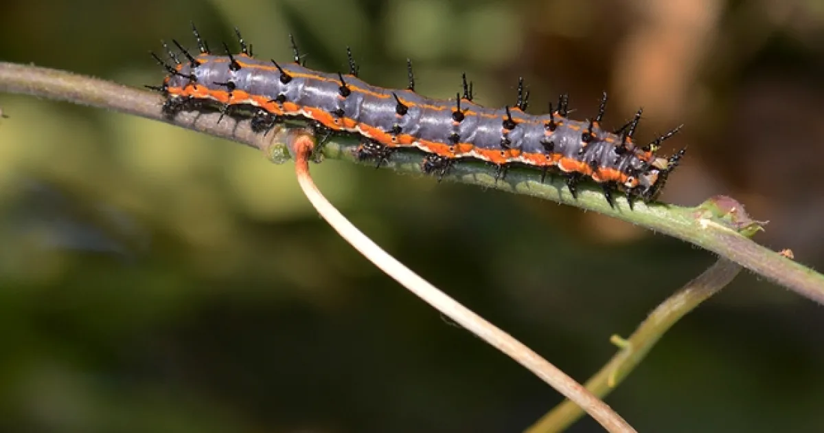 A frost-bitten passionflower vine on a front porch near downtown Vacaville, Solano County, last weekend still contained a number of Gulf Fritillary caterpillars, some viable chrysalids, and some empty paper-thin chrysalids fluttering in the wind. The passionflower vine is the host plant of the Gulf Fritillary, Agraulis vanillae. These colorful reddish-orange butterflies lay their eggs on this plant, and the resulting larvae or caterpillars skeletonize the leaves.