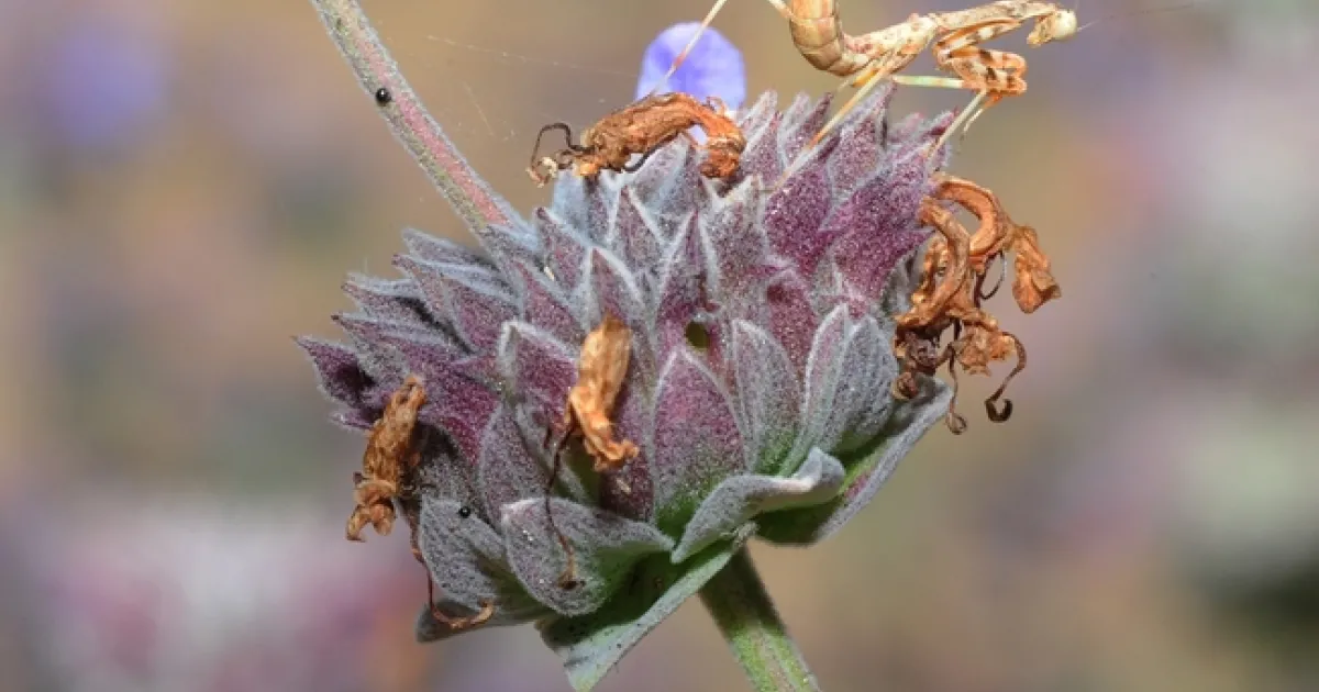 A praying mantis hanging out on a cleveland sage, Salvia clevelandii, at the UC Davis Bee Haven. (Photo by Kathy Keatley Garvey)